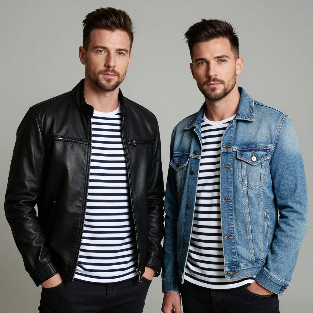 Two men stand side by side against a neutral background, both wearing striped shirts—one in a sleek black leather jacket and the other in a casual denim jacket, exuding a stylish and confident vibe.
