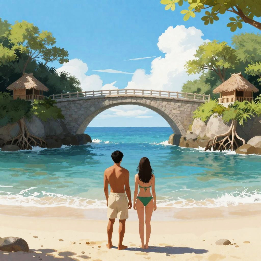A digital painting of two people standing on a sandy beach, facing a turquoise ocean. A massive, arched stone bridge spans the background, connecting two lush, green islands with large tree roots and thatched huts. The man is shirtless, wearing beige shorts, and the woman has dark hair, wearing a green bikini. Both stand close together, gazing at the bridge. The sky is bright blue with scattered clouds.