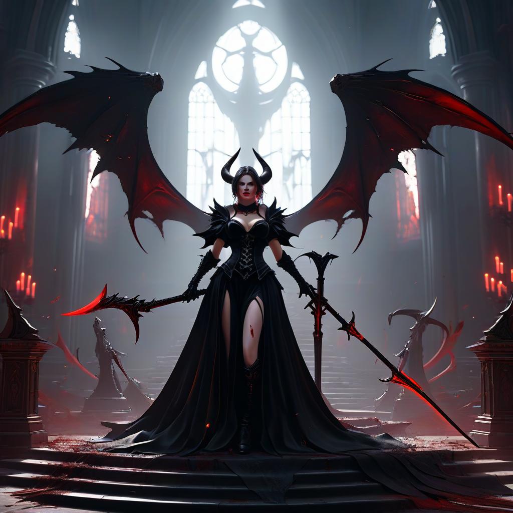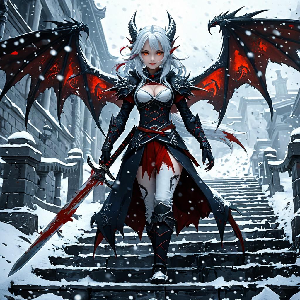 Digital artwork of a fierce, white-haired, black-winged demoness with horns, armored in black, wielding a sword, descending snowy stone steps.