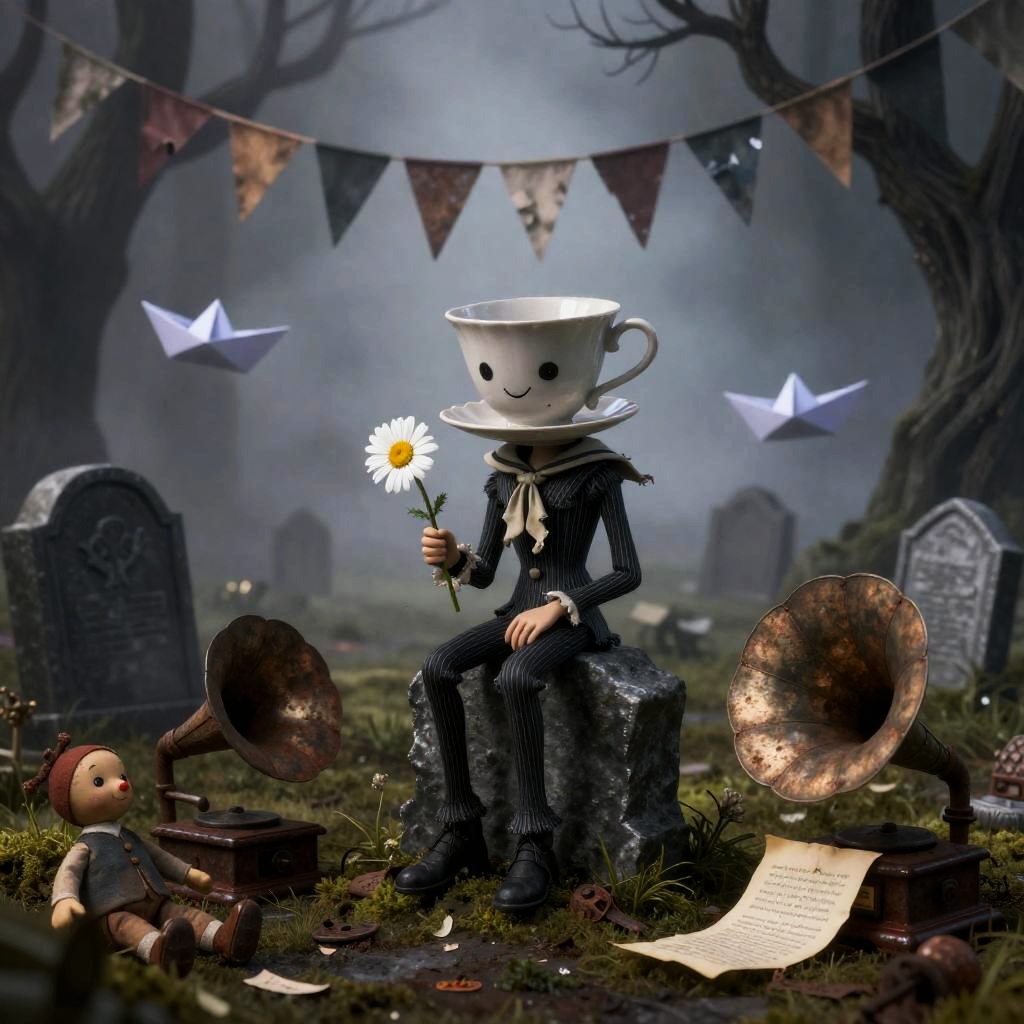 Whimsical art style inspired by Tim Burton, Edward Gorey depicting a teacup-headed child in a threadbare sailor collar clutching a wilted daisy sitting alone on a crooked gravestone in a misty graveyard, surrounded by rusted wind-up toys half-buried in moss, leaning gramophones spilling brittle sheet music, torn bunting fluttering in the chill mist, and ghostly paper boats drifting between gnarled roots.