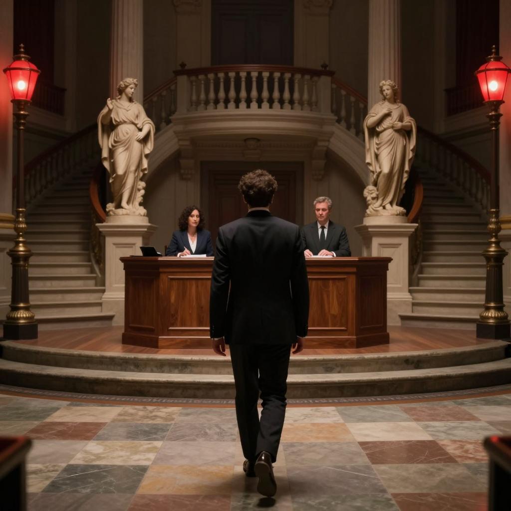 Man in dark suit walks away from a grand, dimly lit stage with three people behind a curved wooden podium. Stage has two large, ornate statues. Red-lamp posts illuminate the marble floor. Stairs lead to an upper balcony.