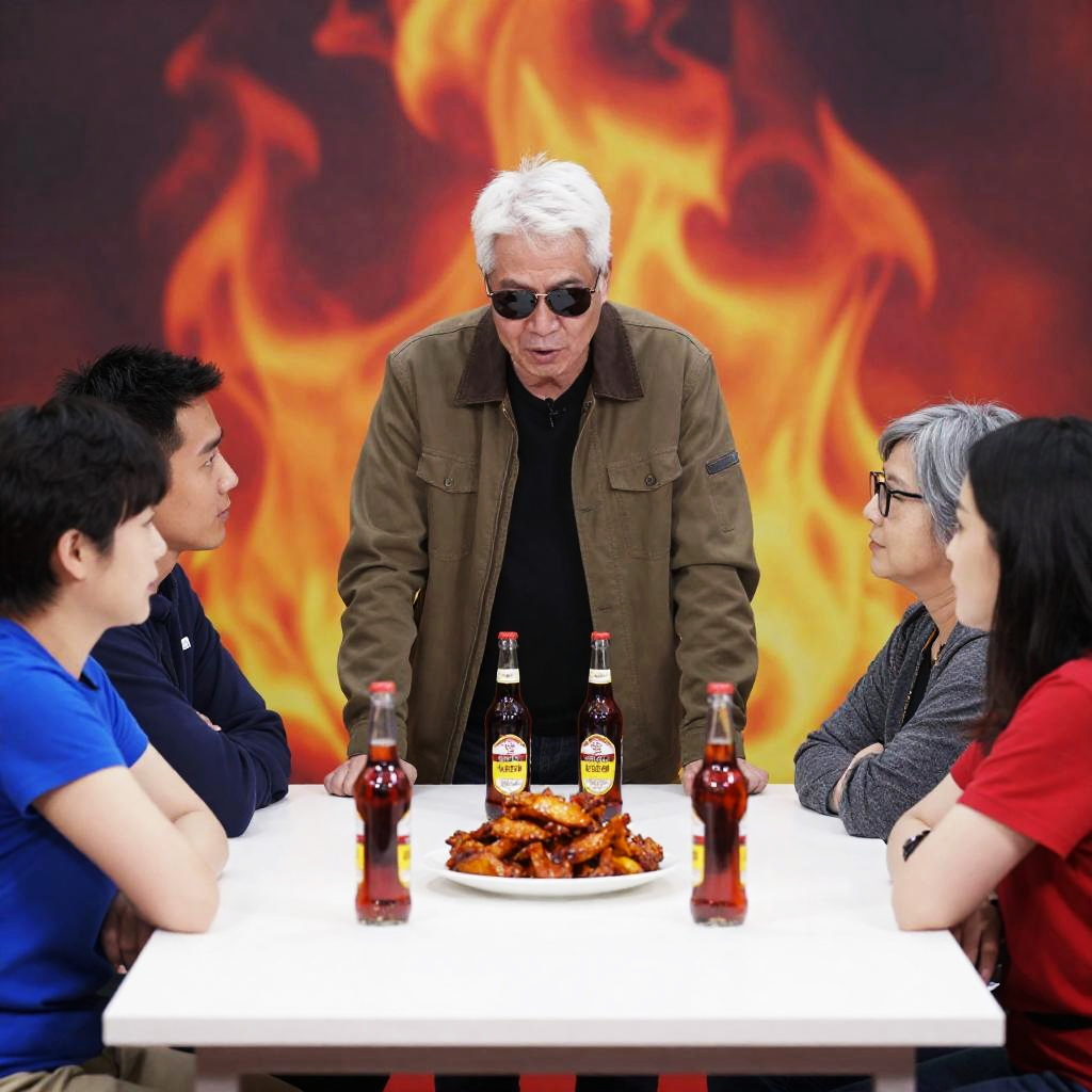 Photograph of a spicy wing challenge. Middle-aged man with white hair, sunglasses, and brown jacket speaks at a table with four bottles. Four participants sit around the table: woman in blue shirt, man in navy hoodie, woman with gray hair and glasses, woman in red shirt. Background has red and yellow flame pattern. Participants have neutral expressions.