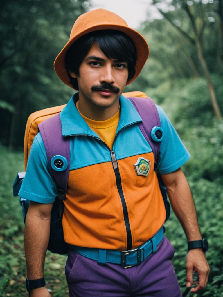 Photorealistic portrait of a young man dressed in a Dora the Explorer cosplay outfit, featuring a purple polo shirt, orange backpack, orange goggles on his head, and matching purple wristband. The subject stands confidently in a forested outdoor setting with lush green foliage in the background.