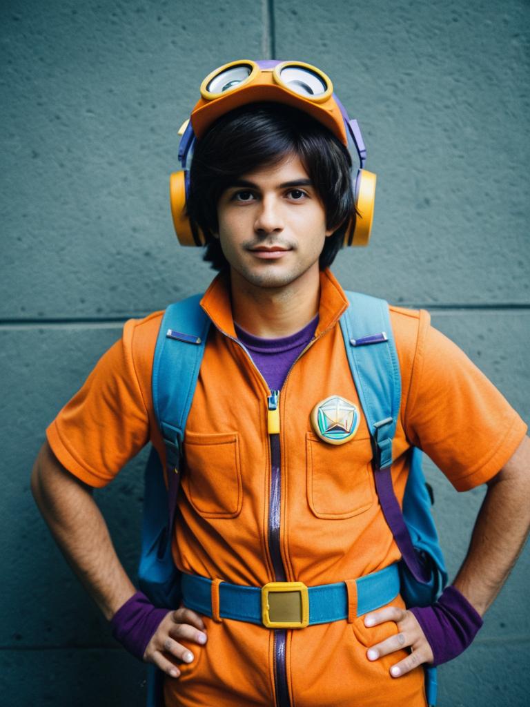 Man in Dora Explorer costume, photorealistic cosplay portrait, cinematic realism