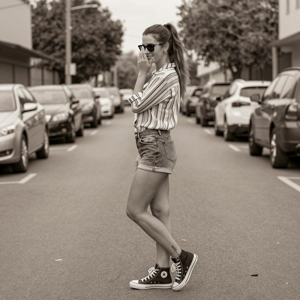 Black and white photo of a woman lying naked on a car hood. She has dark hair, glasses, and her right arm is bent behind her head. She is wearing dark gloves and has her legs stretched out. The car has a Texas license plate, and the background shows trees and buildings under a cloudy sky.