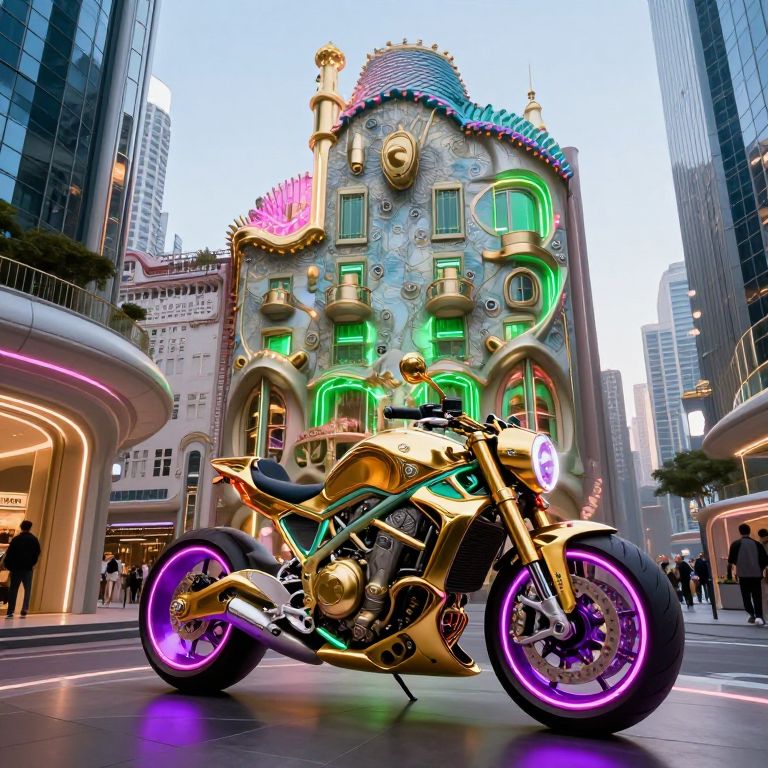 Golden Gaudi-Style Futuristic Motorcycle in Cityscape