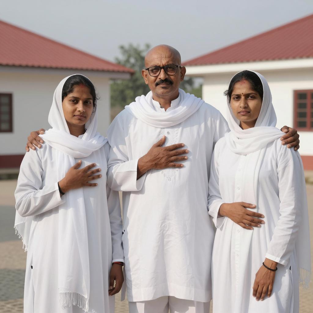 Bald Indian man with glasses, mustache, and white shawl, raising right hand. Dark background, white object on left. Light skin, smiling expression. Upper body visible. One person. Realistic photograph.