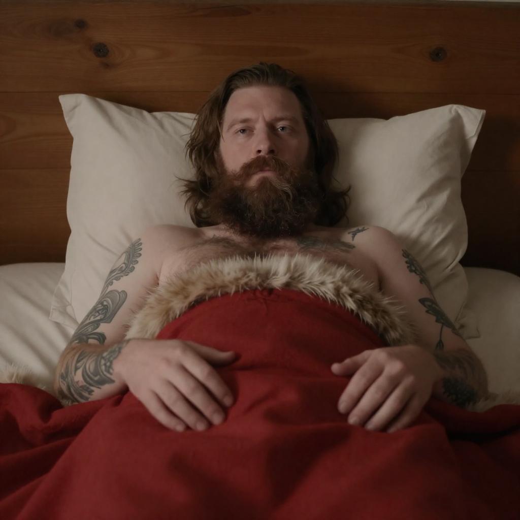 Bearded man with long brown hair, lying in bed, covered with a red fur-trimmed blanket. Wooden ceiling background. Man's hands on blanket, relaxed expression. Tattoos visible on arms. Pillows behind head. Movie still.