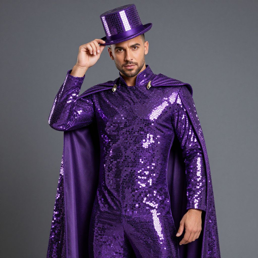 Man Purple Power Disco Costume, purple man in a purple costume and hat and cape