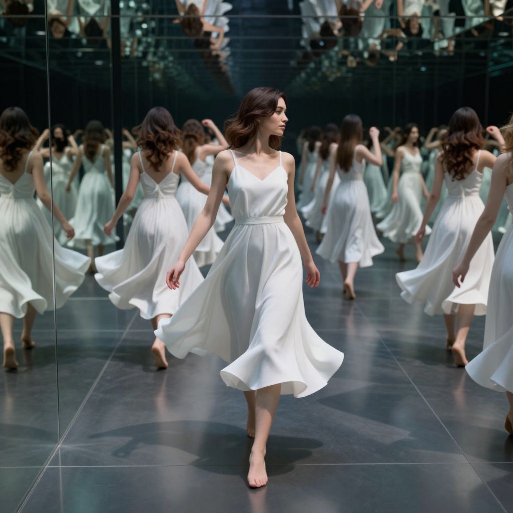 A surreal 3D-rendered scene depicts a woman in a flowing white dress walking through a mirrored corridor, her reflections creating an infinite array of alternate selves, each dancing with shadows cast by dramatic lighting that enhances the ethereal and otherworldly atmosphere.