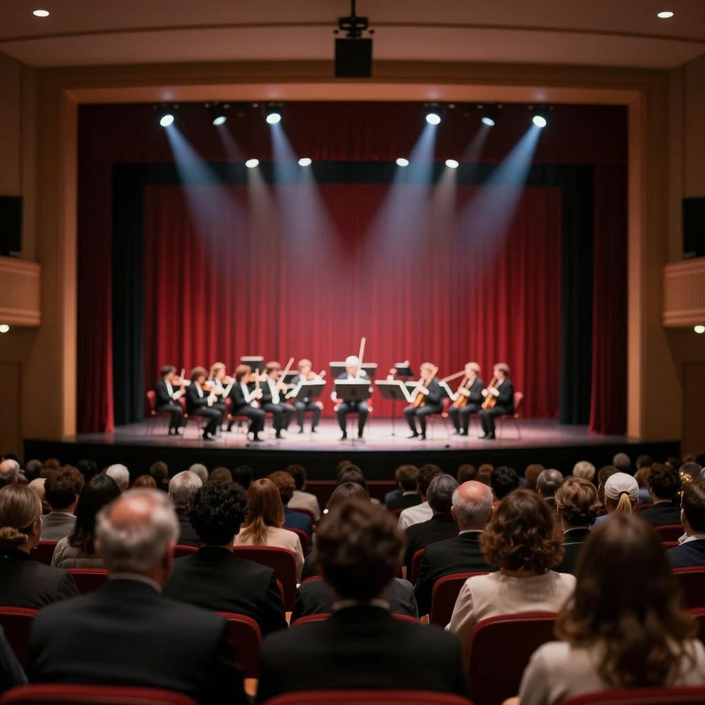 Concert audience in dimly lit theater. Bright stage lights illuminate red curtain. Orchestra on stage, blurred in background. Multiple light beams from ceiling, casting reflections. Approximately 200 people seated, backs facing camera. Dark clothing, indistinct faces. Stage centered, orchestra slightly left.