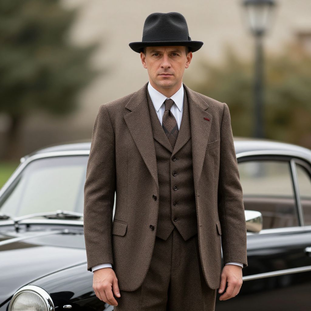 A well-dressed man in a vintage suit and hat stands confidently in front of a classic car, exuding an air of sophistication and style.