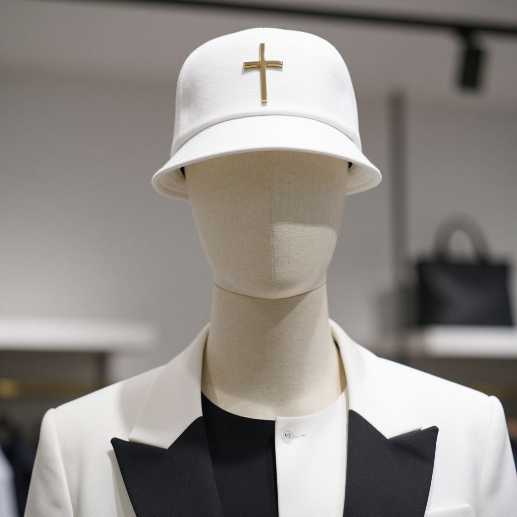 Photograph of a faceless, beige mannequin wearing a white bucket hat with a gold cross and a black-and-white jacket. Blurred background