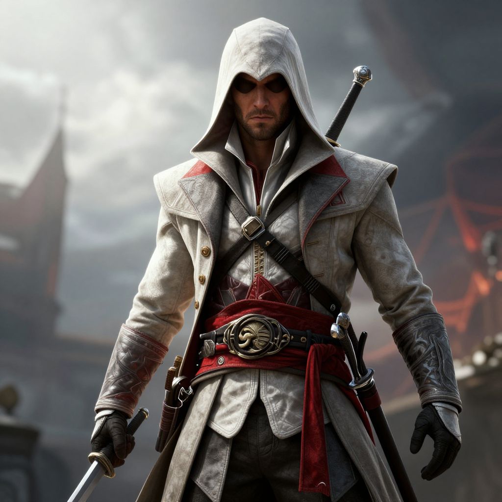 "Assassin Creed, image of a man in a hooded jacket with a sword"