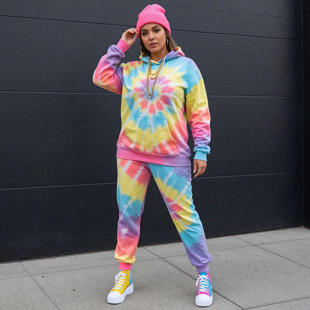 Full body shot, woman, vibrant tie-dye hoodie, oversized fit, soft cotton blend, kangaroo pocket, drawstring hood, matching jogger pants, elastic waistband, tapered cuffs, lightweight fleece, bold color swirls, street style sneakers, chunky sole, high-top design, canvas material, layered gold necklaces, hoop earrings, slouchy beanie, casual vibe, urban backdrop Sexy. Pretty face and beаutiful eyes. Big breasts