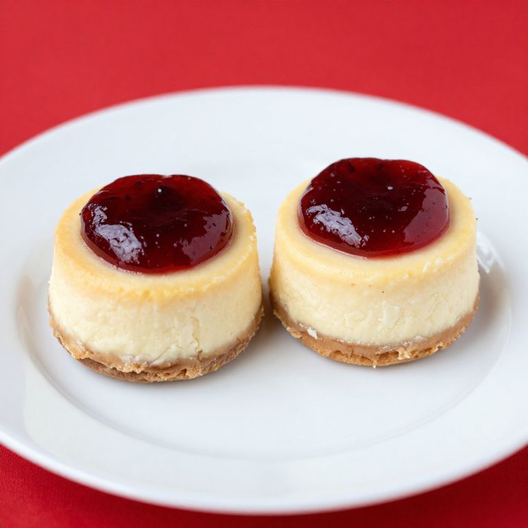 Two perfectly round mini cheesecakes, each topped with a glossy dollop of dark red jam, rest side by side on a pristine white plate, set against a vibrant red cloth backdrop.
