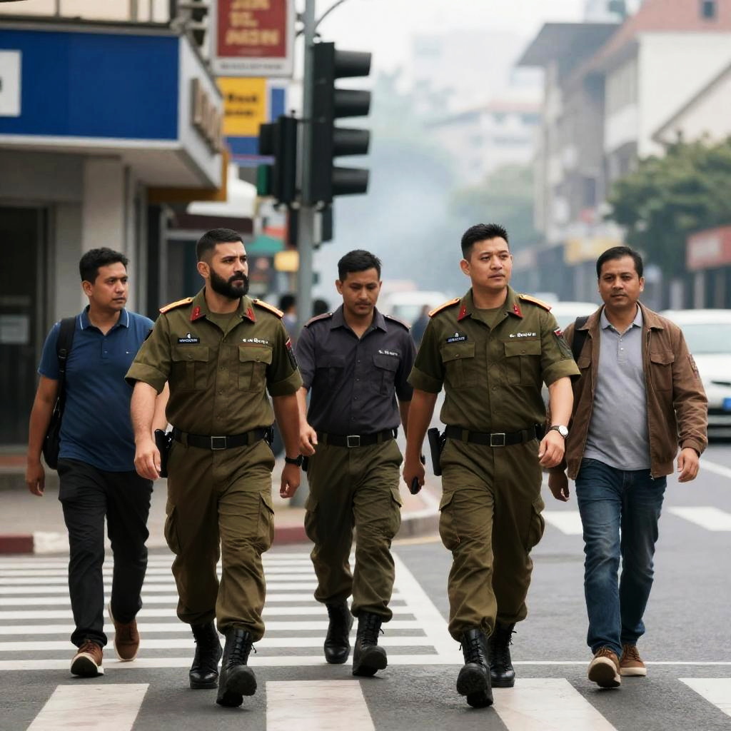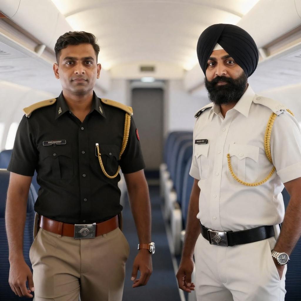Photograph of two male Indian police officers on a plane. The officer on the left, with dark hair and medium build, wears a black uniform with yellow accents and stands confidently. The officer on the right, with a beard and turban, leans forward in a white uniform. The plane's cockpit is visible in the background.