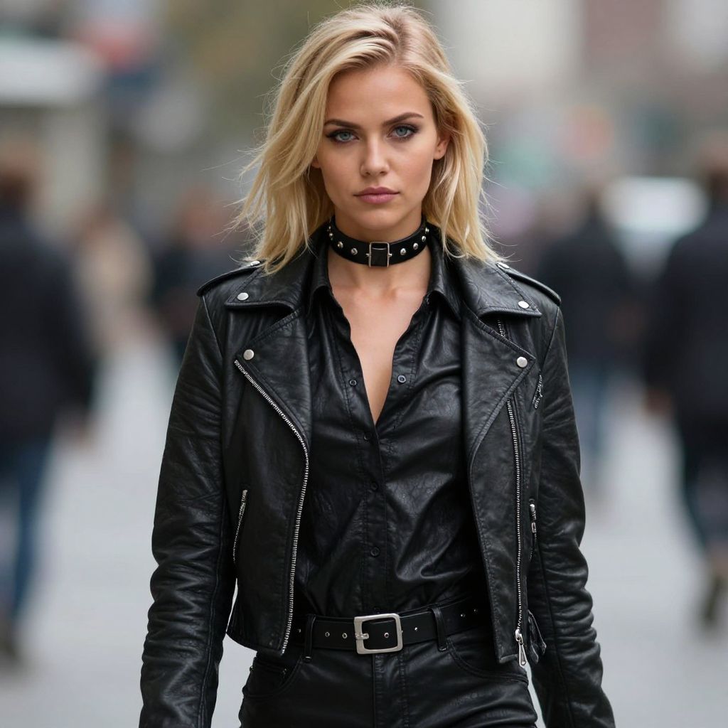Photograph of a blonde woman with blue eyes, wearing a black leather jacket, black shirt, and spiked choker, walking confidently in an urban street