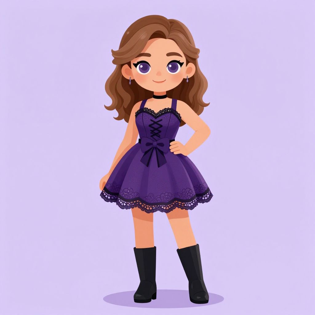 Digital illustration of a cute, anime-style girl with light skin and wavy brown hair. She has large, purple eyes and a small, confident smile. She wears a sleeveless, dark purple dress with black lace trim and a ribbon bow at the front. Her dress has a fitted waist and a flared skirt. She also wears black knee-high boots and a black choker necklace. She stands with one hand on her hip, exuding a playful and confident demeanor. The background is plain white, making her the focal point of the image. The overall style is colorful and cartoony, with smooth lines and vibrant colors.