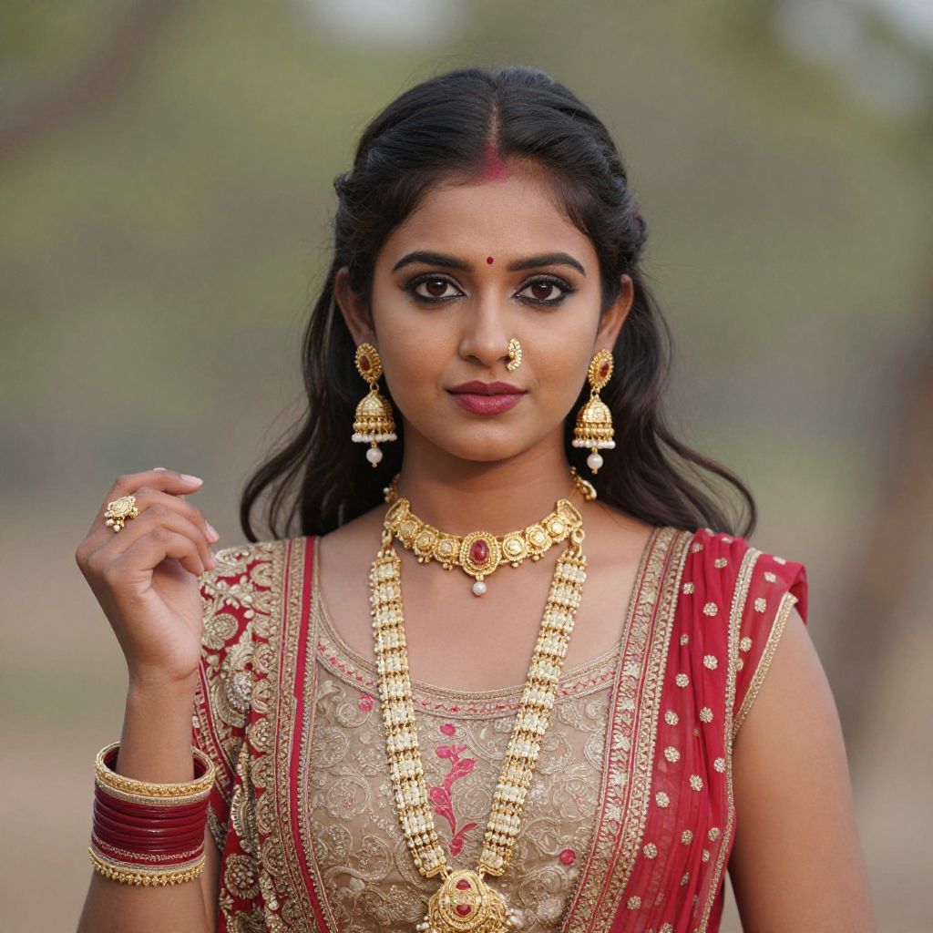 Photograph of an Indian woman with medium brown skin, long black hair, and red bindi on her forehead. She wears a red and gold traditional saree with intricate embroidery. Her jewelry includes a large gold necklace with red gemstones, matching earrings, a nose ring, and multiple gold bangles on her right wrist. She is holding a gold ring close to her chest with her right hand. The blurred background shows green and brown hues, suggesting an outdoor setting. Her makeup is subtle, with dark eyeliner and pink lipstick. The overall style is elegant and traditional.
