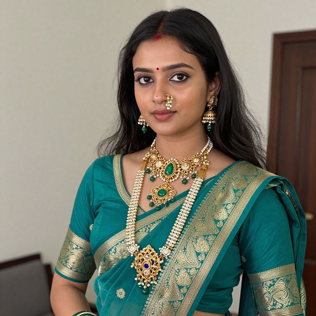 Photograph of a beautiful Indian woman with dark hair, wearing a red and gold traditional saree, adorned with gold jewelry, including a necklace, earrings