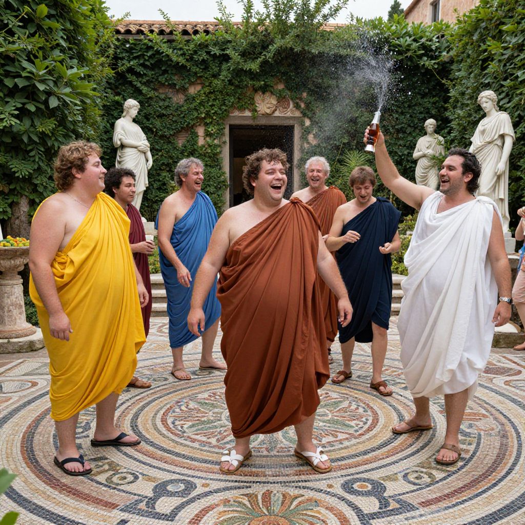 A humorous fat toga party in a grand Roman villa, featuring people dressed in oversized togas, laughing and spilling wine, with intricate mosaic floors and lush greenery, vibrant colors capturing the lively festive atmosphere and classical sculptures around.