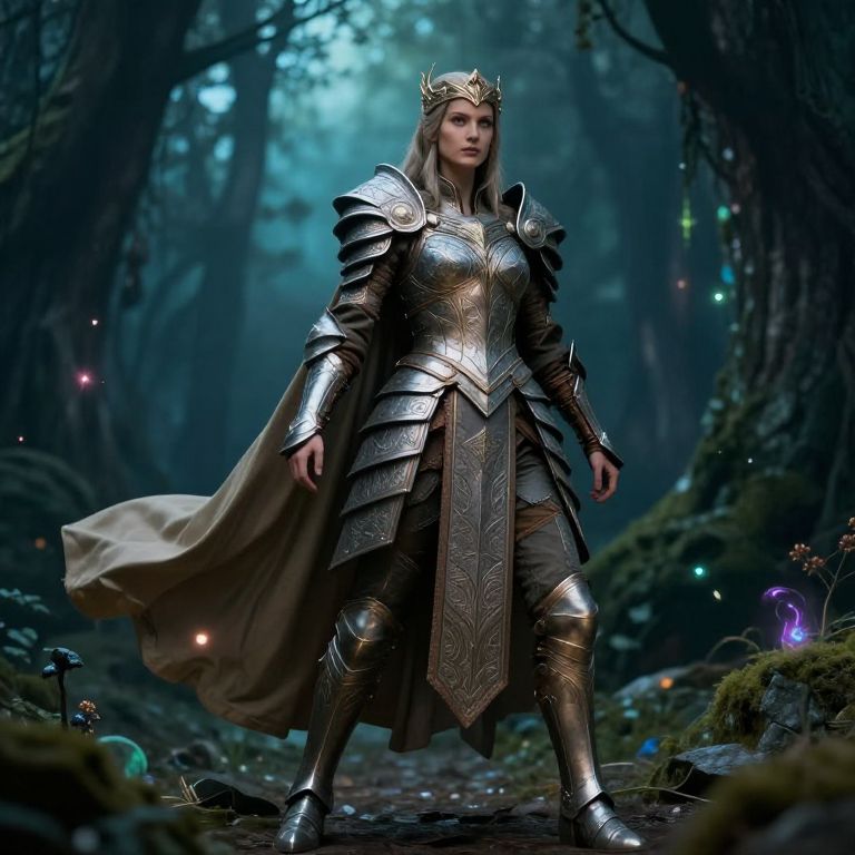 Full body outfit of a fantasy warrior queen, ornate armor with detailed engravings, flowing cape, battle-ready stance, set in a mystical forest with magical glowing elements.