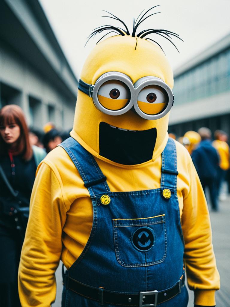Man in Minion costume, cosplay editorial photography, realistic tones