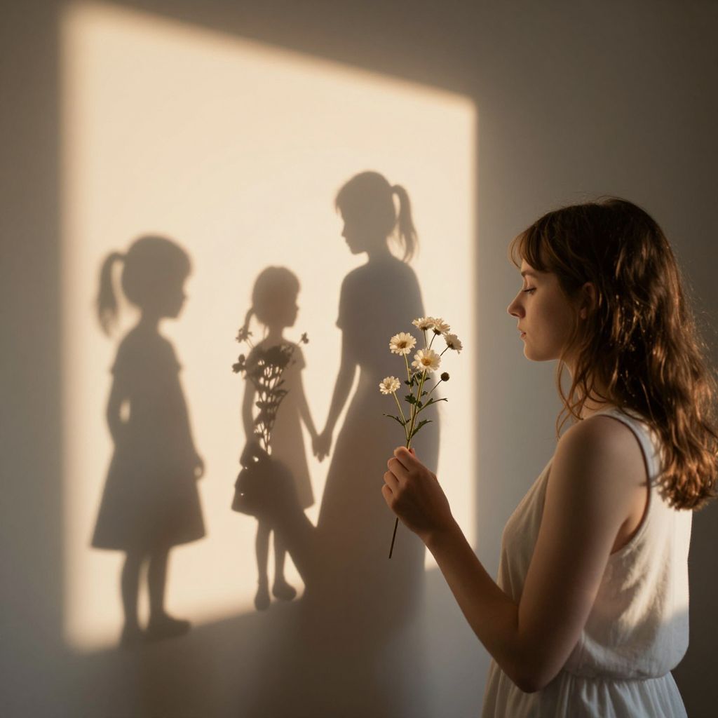 Woman holding a delicate sprig of flowers casts intricate shadows of three figures—a child, a girl, and herself—onto a sunlit wall, creating a poignant silhouette narrative in a warmly lit room.