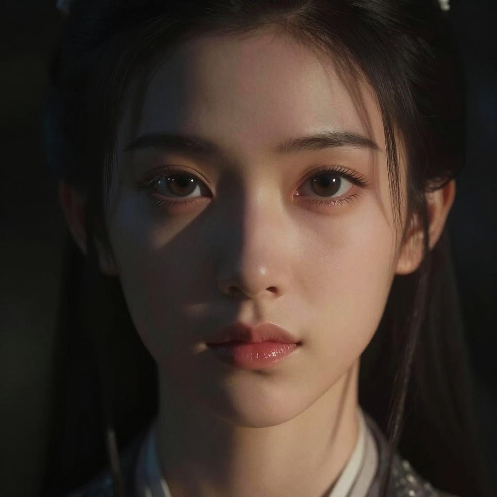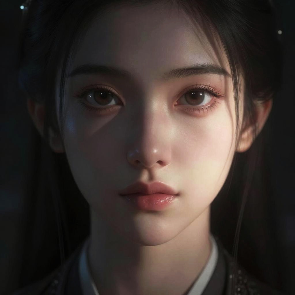 Photorealistic close-up portrait of a young Asian woman with fair skin, dark brown eyes, and long black hair, softly lit from the left side
