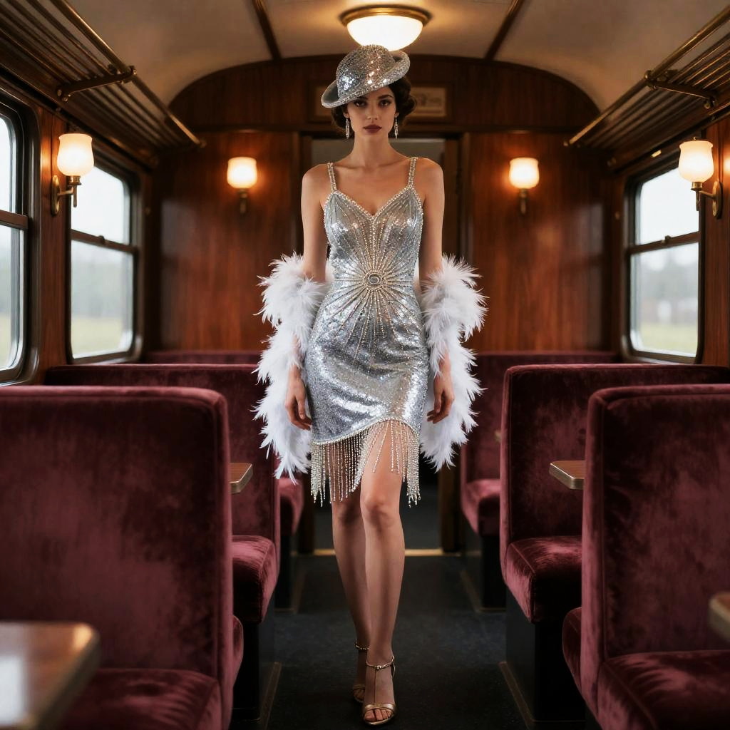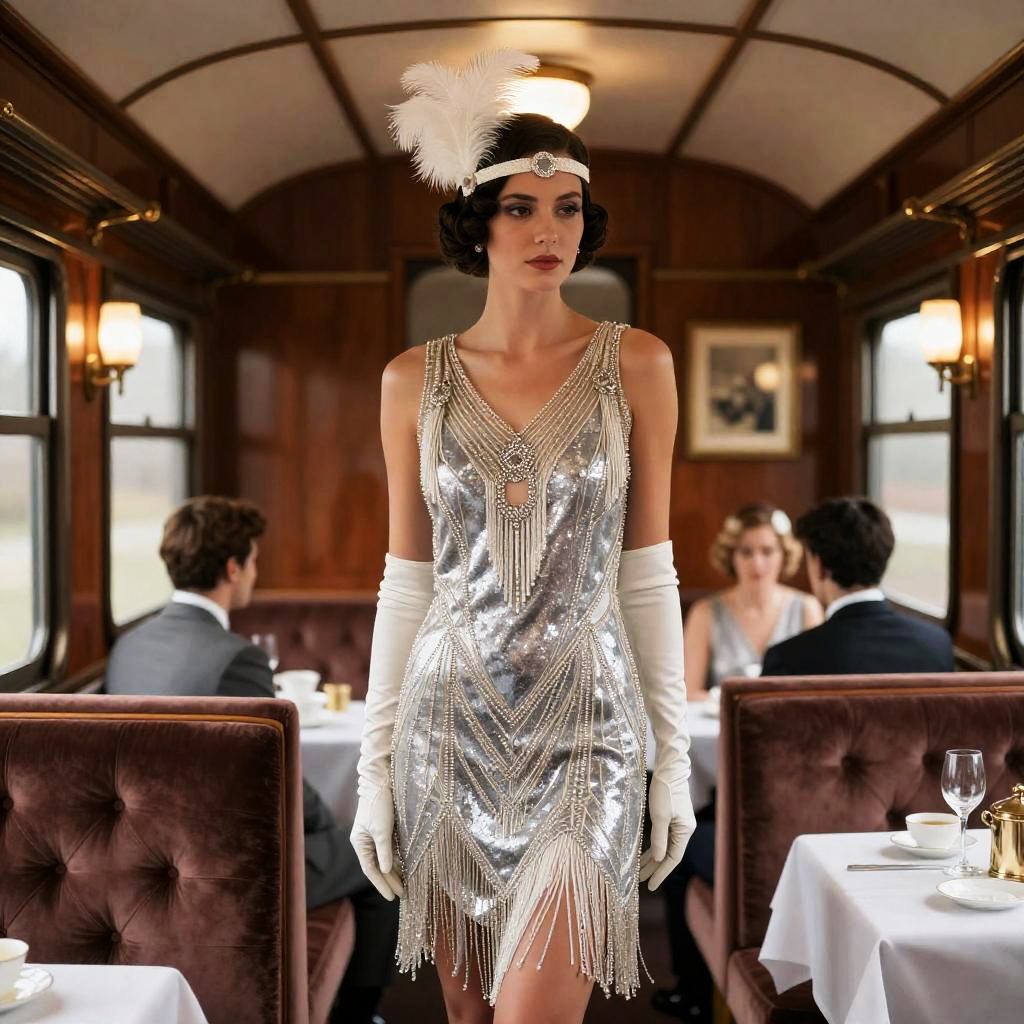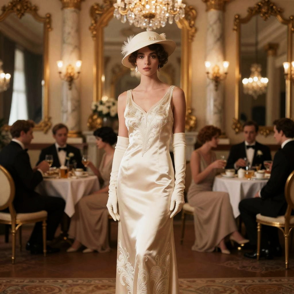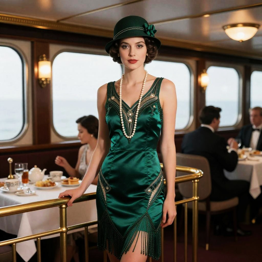 Woman in Black Lace Dress at 1920s Art Deco Tea Lounge
