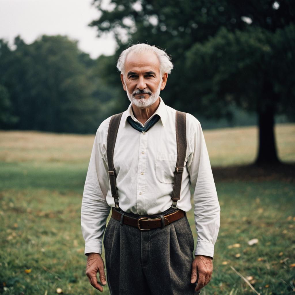 Close-up portrait of an elderly man with white hair and beard standing outdoors. He wears a light striped collared shirt under a dark vest, with wrinkled skin visible. The background is a blurred natural setting with trees and greenery.