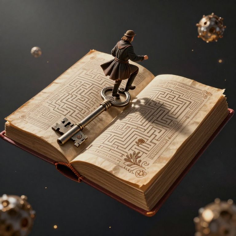 A digitally rendered image shows an open, ancient-looking book with intricate maze-like patterns on its pages, floating in a dark, starry space. A small, detailed figurine of a Victorian-era man in a long coat and bowler hat stands on the right page. A large, ornate key is positioned diagonally across the left page. The book has a red cover and the pages are yellowed. Surrounding the book are small, spherical, metallic-looking objects with spikes. The lighting casts a warm glow on the book, highlighting its textures and details. The overall style is surreal and whimsical.