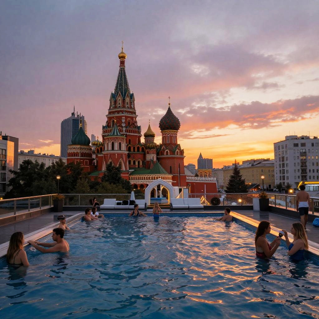 Pool in Russian urban setting, rooftop pool with city skyline of Moscow at sunset, vivid colors, people relaxing, modern vibe with subtle traditional Russian motifs, cinematic lighting