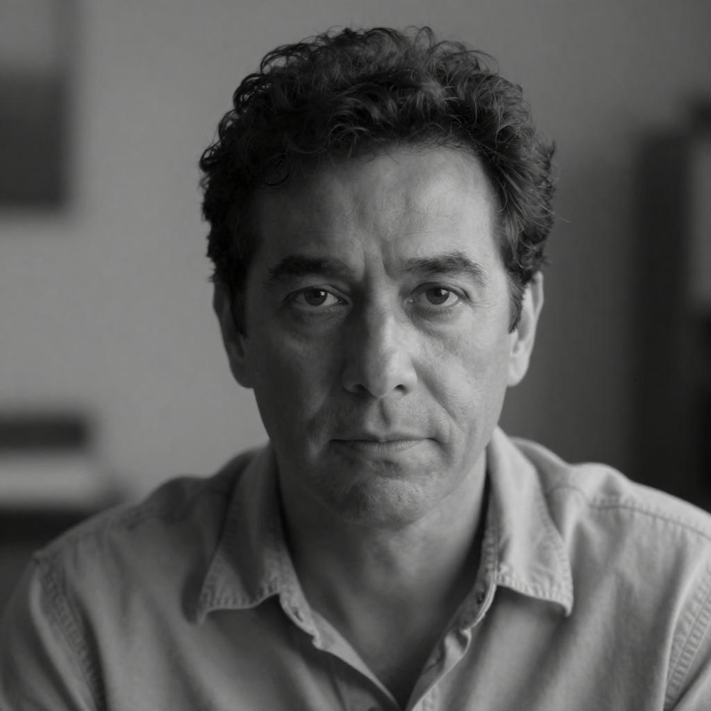 Photograph of a middle-aged man with short, dark brown hair and a slightly rugged face, wearing a dark gray, short-sleeved polo shirt. He is seated against a light blue wall with a beige corner visible on the left. His expression is serious and focused. The lighting is bright, highlighting his facial features.
