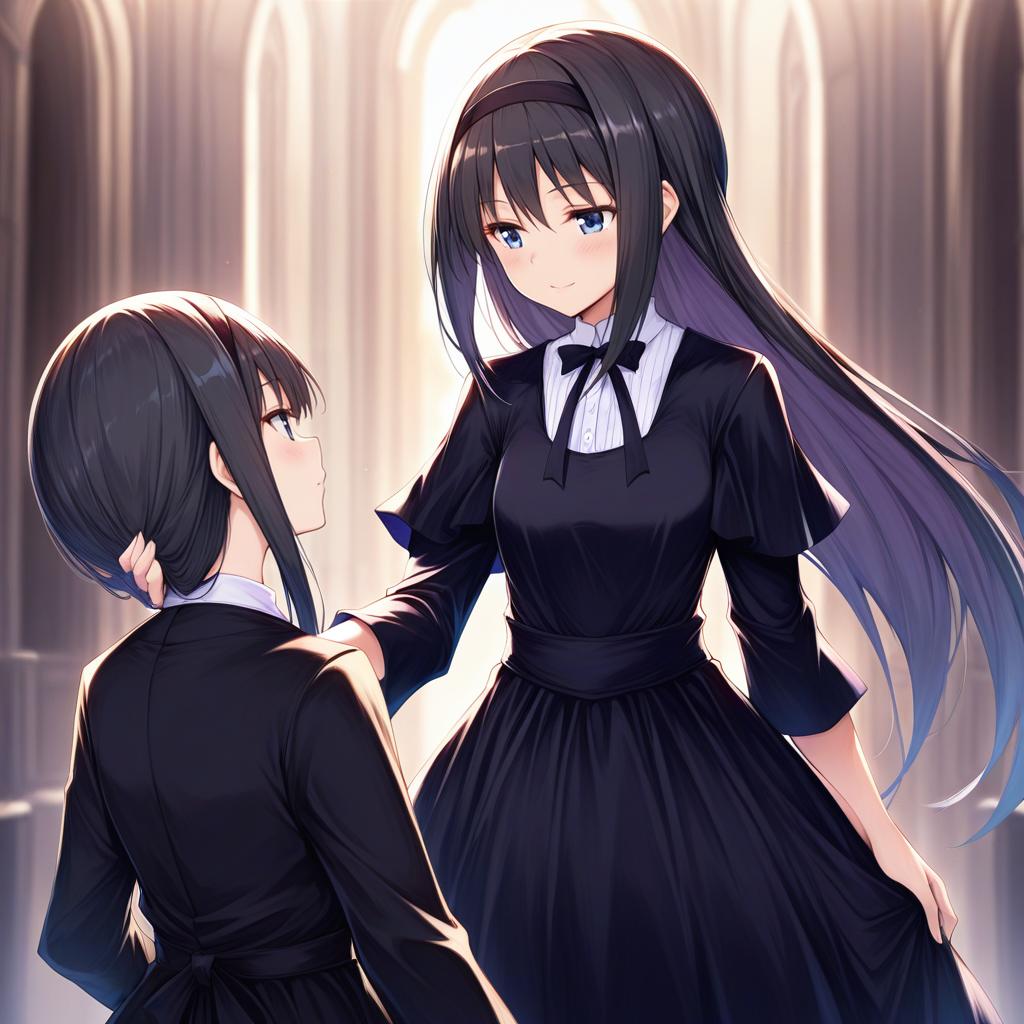 Illustration of Akemi homura (black dress), mahou shoujo madoka magica in the style of Fal maro