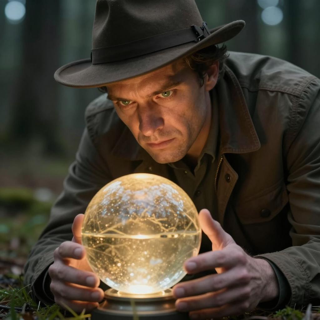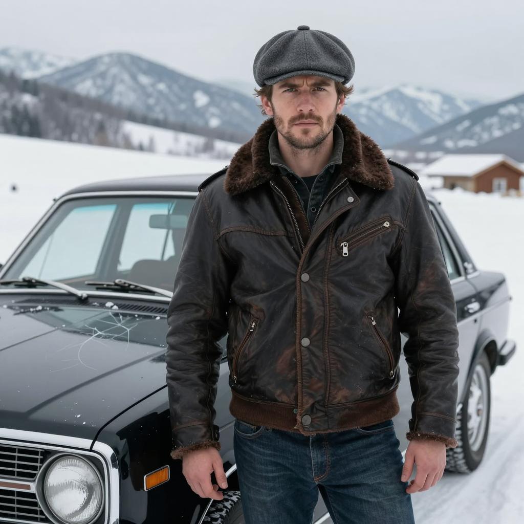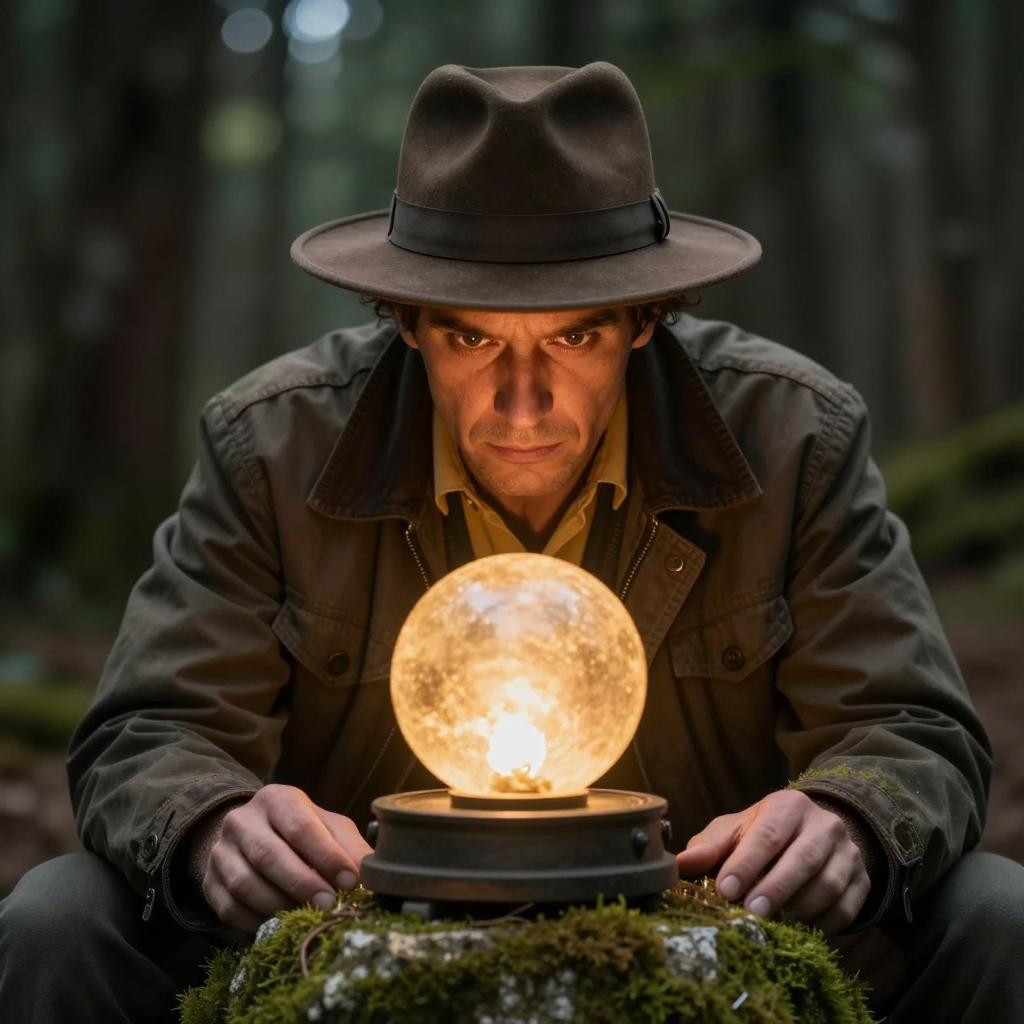 Man with beard, wearing beige sweater, brown pants, and flat cap, crouches on rocky ledge. Mountainous landscape with snow-capped peaks in background. Full moon in sky. Rusty metal tools and black box near man. Sparse vegetation. Evening light.