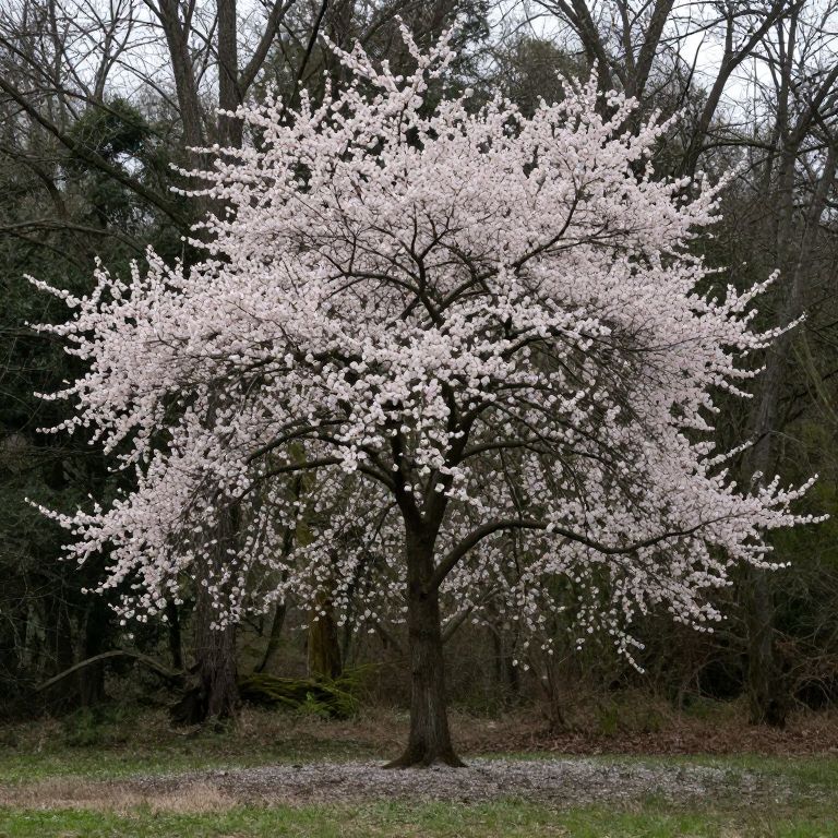 Photograph of a blooming cherry tree with pale pink flowers, standing alone in a dark, wooded area with grassy ground.
