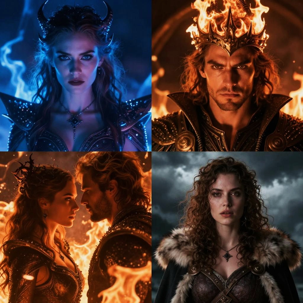 Photograph collage of four close-up shots from a fantasy film featuring two characters with dramatic lighting. Top left: A blonde woman with blue-tinted skin, wearing a metallic crown and dark armor, illuminated by blue light. Top right: A bearded man with fiery orange flames on his crown, in dark armor, with intense expression against an orange background. Bottom left: Side profile of the woman and man facing each other, both partially lit by fiery orange light. Bottom right: The woman with curly brown hair, dark eyes, and fur-trimmed black cloak, against a dark cloudy sky. All characters have intense, dramatic expressions.