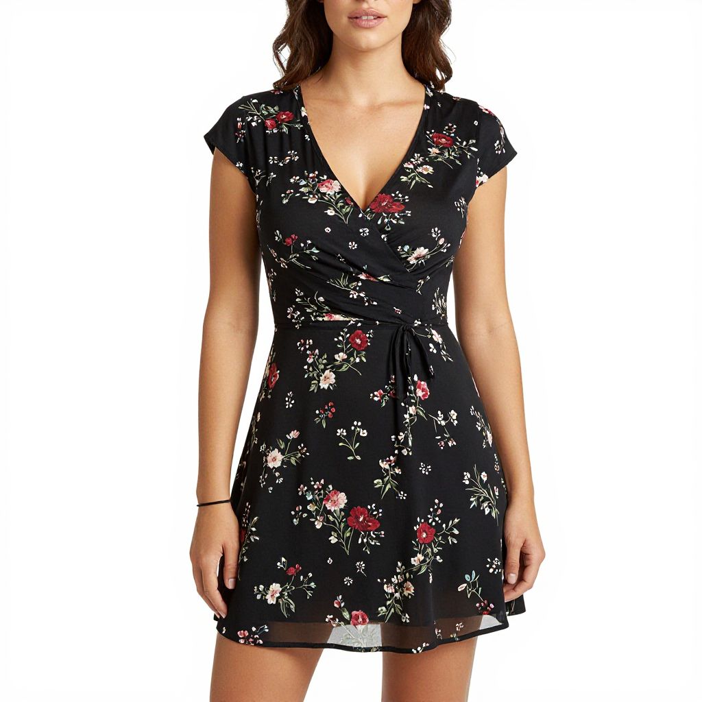 "Woman, casual summer style, black floral print mini dress, v-neckline, cap sleeves, A-line skirt, cinched at the waist, delicate floral pattern in red, pink, and green, simple black bracelet, white background.. Sexy. Pretty face and beаutiful eyes. Big breasts."