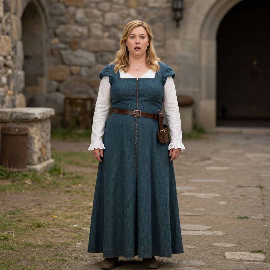 Photograph of a fair-skinned woman with brown hair, wearing a medieval-style, beige, long-sleeved dress and a maroon cape with a green brooch at the neckline. She stands in front of a serene countryside setting with a small stream, greenery, and rustic cottages with thatched roofs in the background. The sunlight filters through the trees, casting soft shadows. The woman's expression is neutral, and she looks directly at the camera. The image has a realistic, slightly enhanced style, with vivid colors and sharp details.
