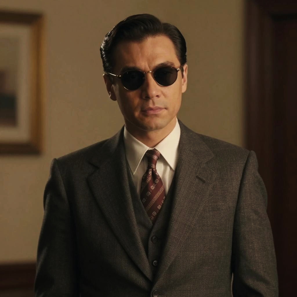 Photograph of a Caucasian man with dark, neatly combed hair, wearing black aviator sunglasses, a dark gray three-piece suit, white dress shirt, and a red patterned tie. He stands in a dimly lit room with beige walls and a framed picture in the background. The lighting casts soft shadows, emphasizing his serious expression. The man's attire and style suggest a 1950s or retro-inspired look. The overall mood is mysterious and sophisticated.