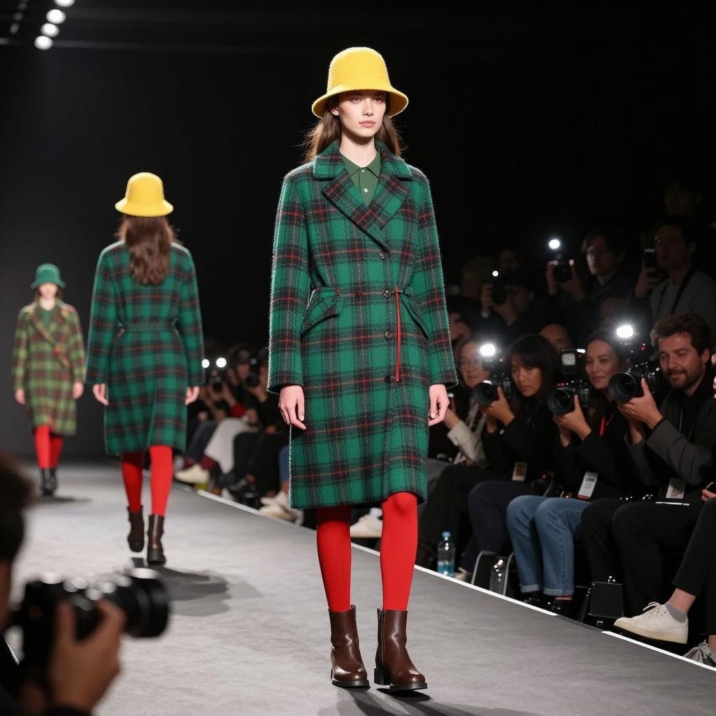 Fashion runway model in green plaid coat, yellow hat, red tights, and brown boots. Model stands confidently on stage, facing forward. Background: dark stage, multiple photographers with cameras, some holding flashes. Overhead stage lights visible. Other model in similar outfit stands to the left. Model's expression is neutral. Crowded photographers in foreground.