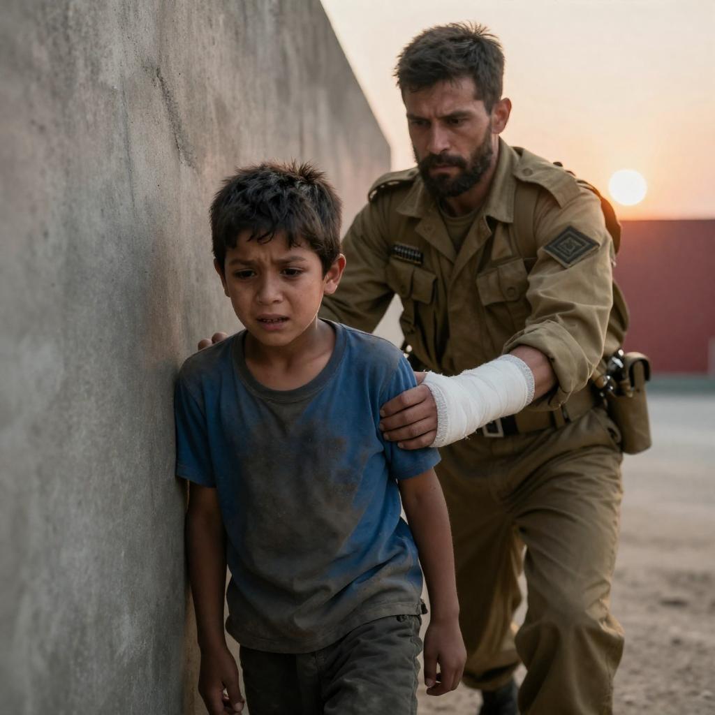 Photograph of a rugged, bearded man in military gear pushing a young boy with short black hair, wearing a dirty blue shirt and gray t-shirt, against a concrete wall. The man's right arm is wrapped in a bandage. Background includes a bright sunset and red structure. The boy looks distressed, while the man appears determined.