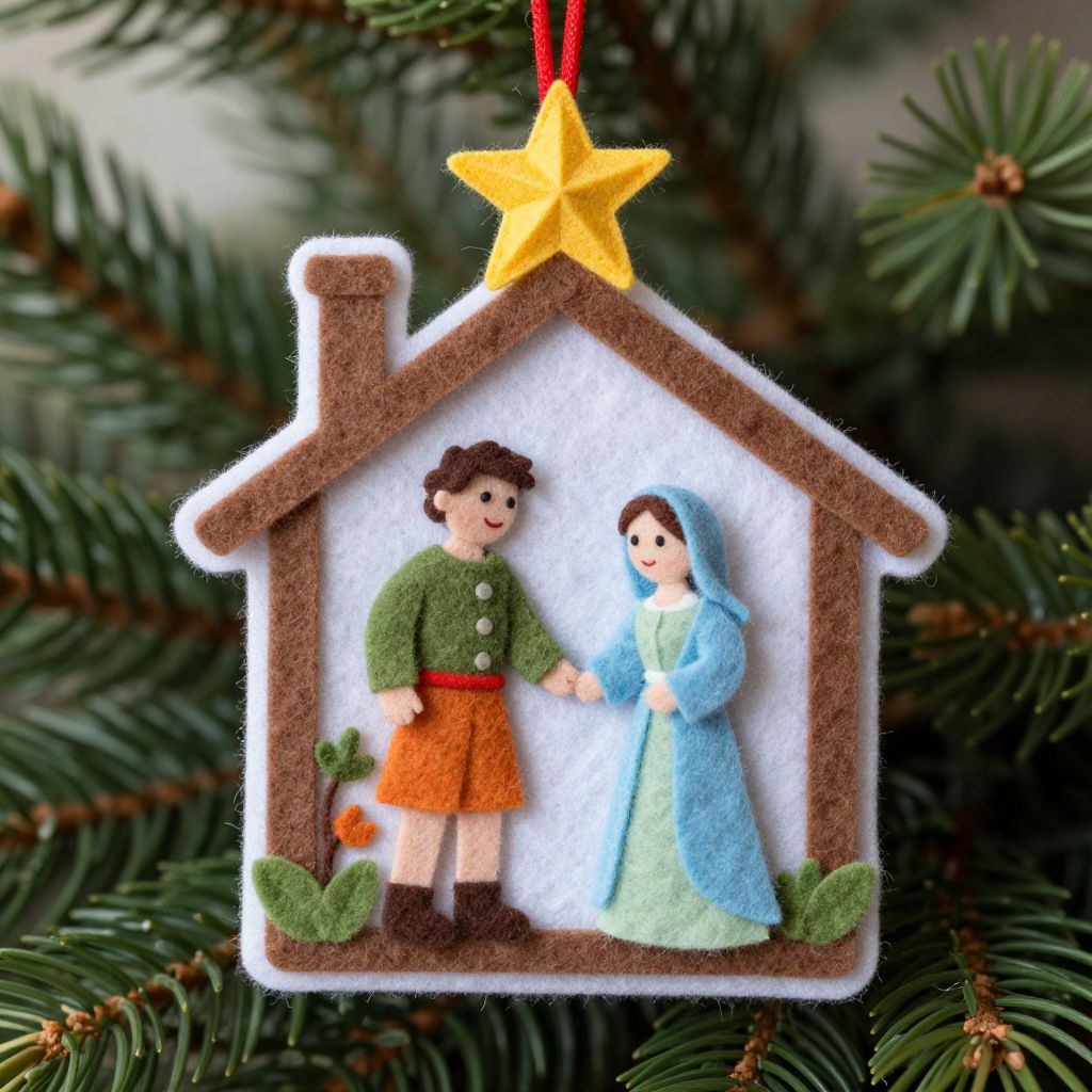 Handcrafted felt nativity ornament featuring two figures—a man in green and orange attire and a woman in blue and green robes—standing inside a cozy house with a golden star atop the roof, suspended by a red string against a backdrop of pine branches.