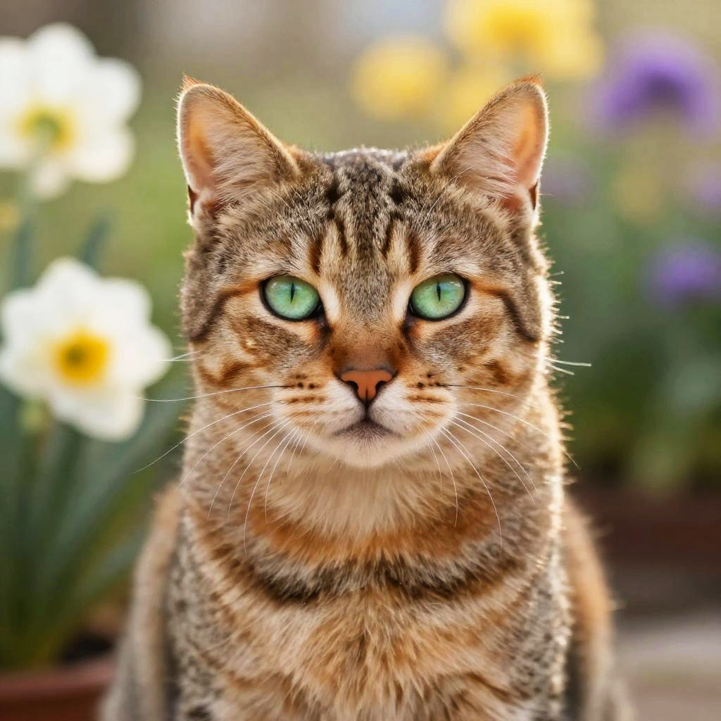 Close-up of an orange and gray tabby cat with bright green eyes, intricate fur stripes, sitting in a garden surrounded by blooming flowers and soft morning light