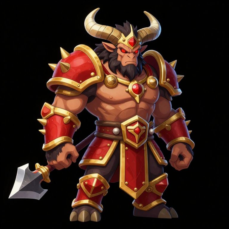 The image depicts a highly detailed 2D game monster design, reminiscent of a wizardry style, with a full-body drawing of a minotaur. The minotaur stands prominently against a black background, exuding a sense of power and ferocity. Its body is muscular and covered in a mix of dark fur and armor, with prominent red and gold accents. The minotaur's head is adorned with large, curved horns, and its face is fierce, with glowing red eyes that add to its intimidating presence. It is equipped with a large, sharp weapon, held in its powerful hands, which are encased in spiked arm guards. The minotaur's attire includes a red loincloth and a belt with intricate designs, further enhancing its formidable appearance. The overall composition is balanced, with the minotaur centrally positioned, drawing the viewer's attention immediately to its imposing figure. The interplay of colors, textures, and shapes creates a dynamic and visually striking image, capturing the essence of a powerful and mythical creature.