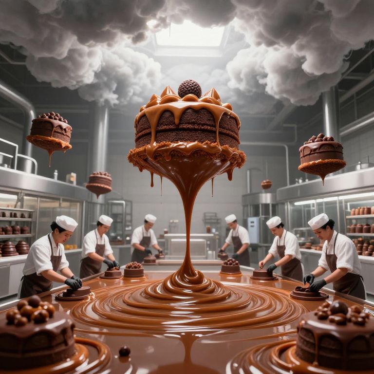 A chocolate factory where workers rise from rivers of melted caramel, crafting floating cakes that hum lullabies to ravenous clouds.