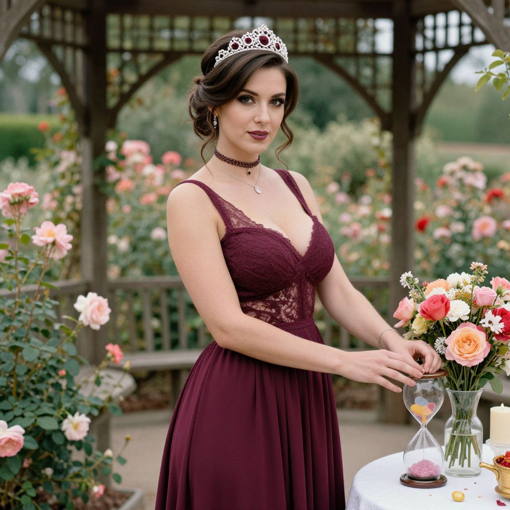 Photograph of a curvy brunette woman with long wavy hair, large breasts, wearing a pink-feathered white dress, standing in a garden