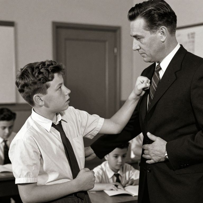 Trend a 12 yeard old boy punching a teacher in the stomach. the year is 1958. realistic faces. cinematic.,